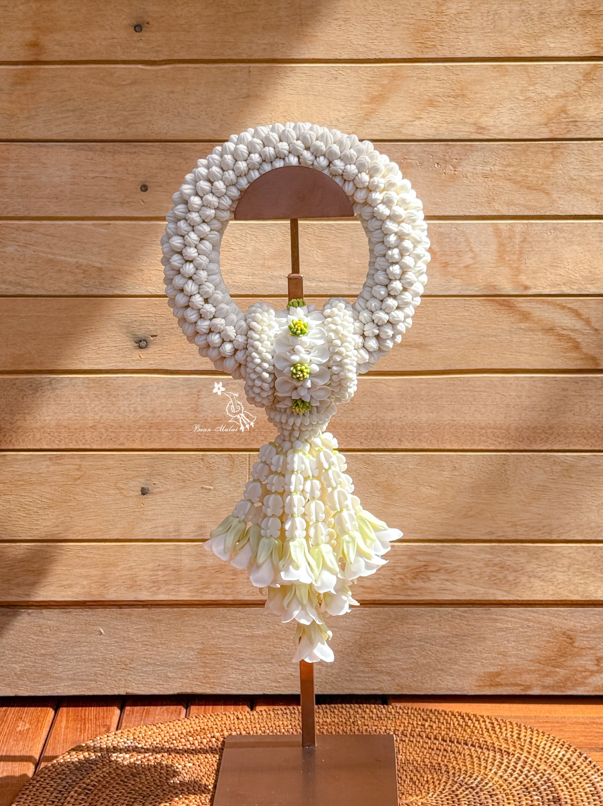พวงมาลัยมะลิ ดอกข่าบาน พวงละ 2,700 บาท เส้นผ่าศูนย์กลางประมาณ 4 นิ้ว กว้างสุดประมาณ 7 นิ้ว ความยาวทั้งพวงประมาณ 14 นิ้ว